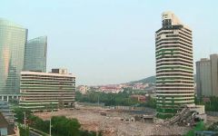 2013年6月10日清晨5时16分,随着一连串低沉的爆破声,高达95米的青岛海天大酒店两座大楼在晨曦中徐徐坠落倾倒。