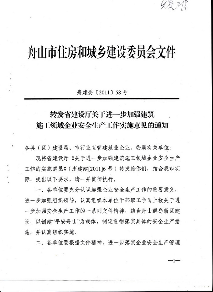 关于“进一步加强建筑施工领域企业安全生产工作实施意见”的通知
