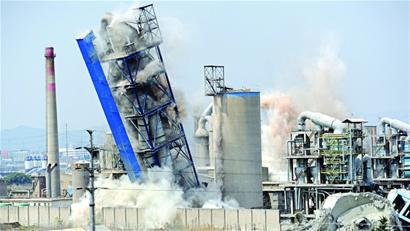 据介绍,这次定向爆破共使用了192公斤炸药和420根雷管,相对国内很多定向爆破而言,“用药”算是很轻的。但由于两座预热器高度近百米,而且自重很大,所以爆破难度较大,达到了最高级别A级,要求爆破的精准度非常高。因此,技术人员从24日早上7点钟就开始布置了爆炸点的炸药和雷管,大约用了5个小时。从最后结果来看,此次定向爆破完全达到了当初的设计目标。