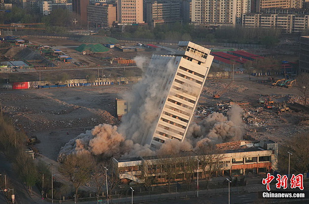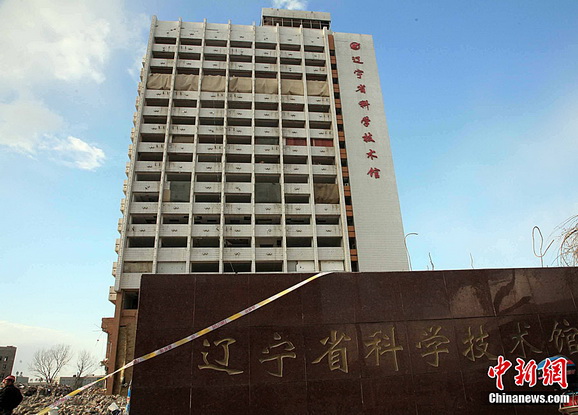 4月28日清晨5时30分,随着一声巨响,位于沈阳市青年大街与文艺路交叉路口的18层56.7米的辽宁科技馆大楼爆破成功,原址将建全国首个体验式文化广场。黄金昆 摄 图片来源:CNSPHOTO