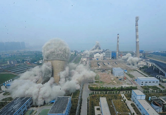 10时8分,本次爆破的指挥长、皖能合肥发电有限公司总经理方世清向爆破人员发出引爆令,百米高的烟囱和冷却塔瞬间化为废墟,距离爆破点仅15多米的制氢站完好无损。