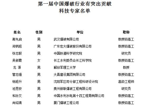 全体与会专家在公平、公正、公开、求是的原则下,经过认真审阅资料,民主协商和无记名投票,评选出了10名第一届中国爆破行业有突出贡献科技专家(名单见附件)。