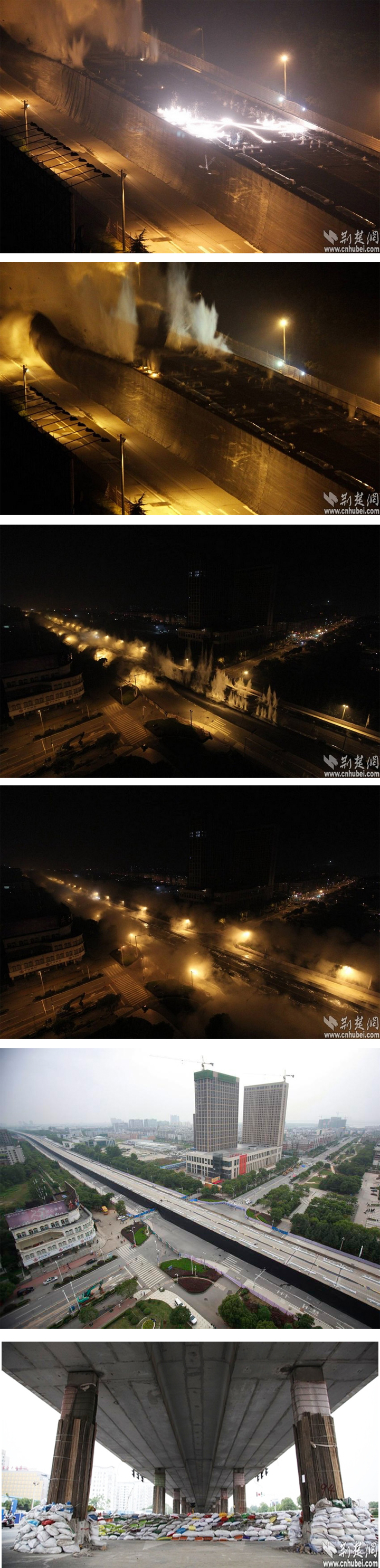 一声巨响,位于84号桥墩的引爆点桥面率先坍塌。以引爆点为中心,两端桥面分别往南北两向,如多米诺骨牌般逐个垮塌下。26秒后,长达3476.5米的沌阳高架桥变成一片废墟。